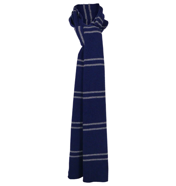 マフラーはレイブンクローを象徴するネイビーブルーとシルバーグレーの配色で、サイズは長さ 約220cm × 幅 約20cm。