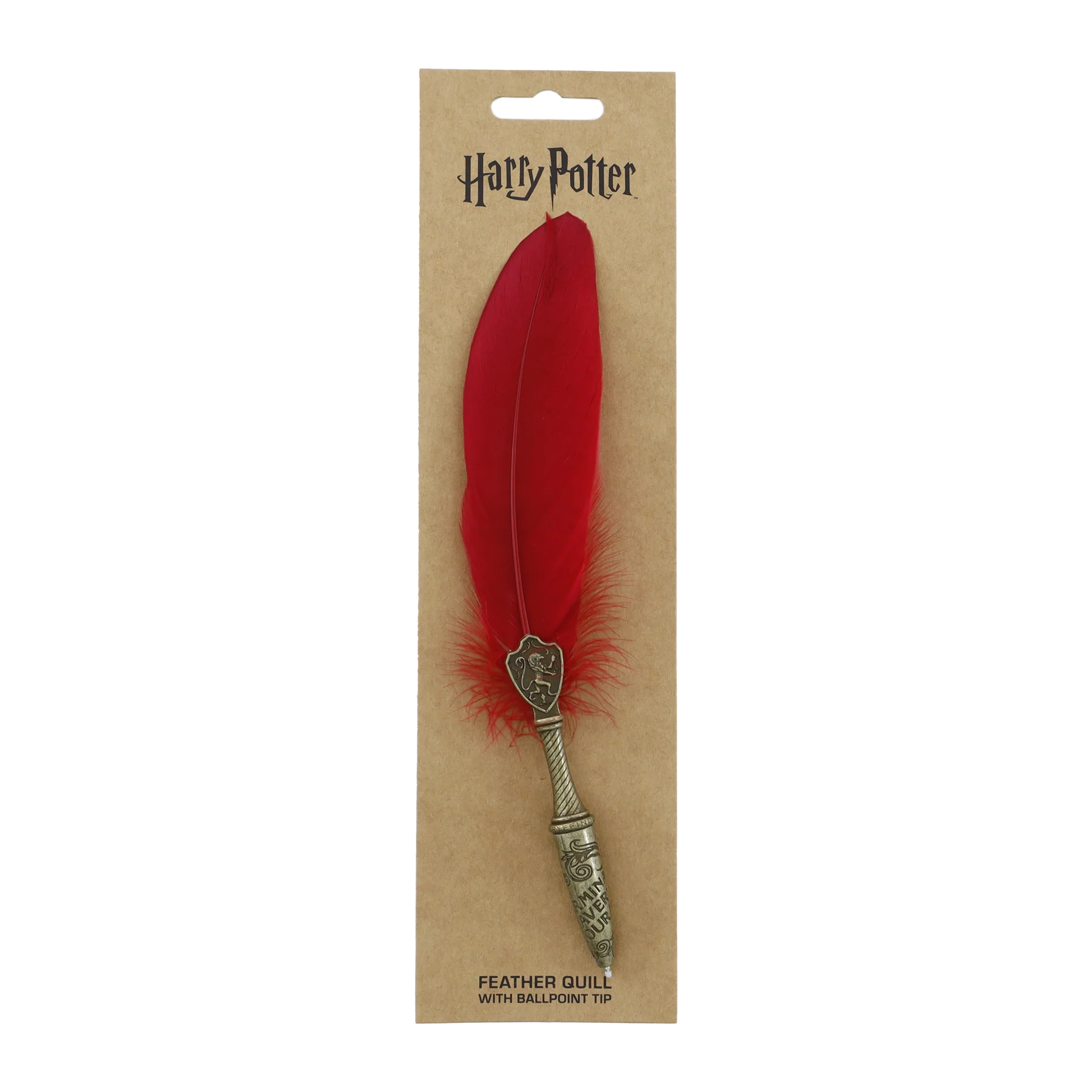 アンティーク調のベースには、華やかなスクロール装飾と精巧なライオンのエンブレムがあしらわれ、軸には「Determination, Bravery, and Courage(決意・勇気・胆力)」の言葉が装飾的なフォントで刻まれています。鮮やかな赤い羽根が炎のようなアクセントとなり、黒インクで書けるこの羽根ペンは、英雄的なエッセイにも、グリフィンドール談話室での呪文練習にも最適です。