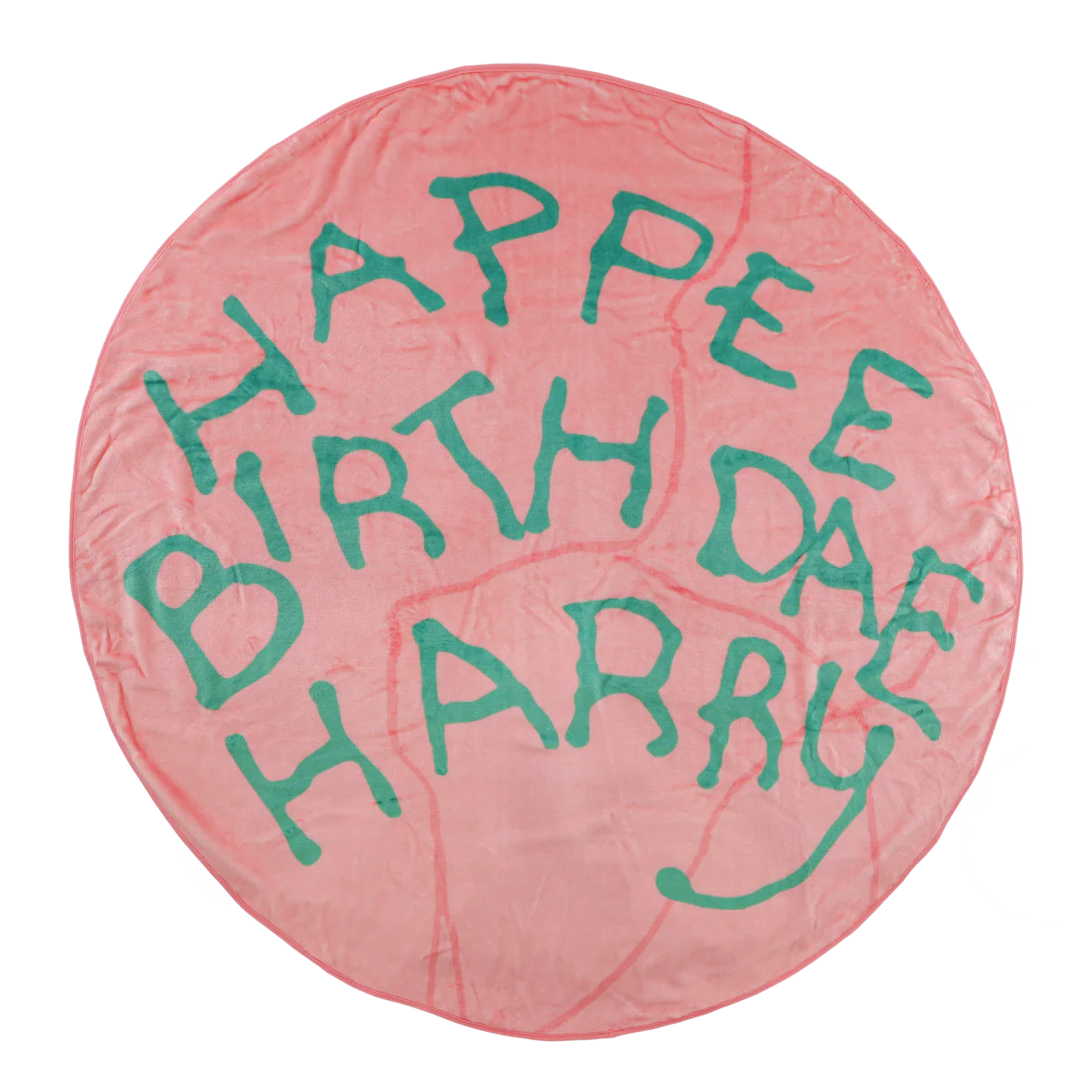 「HAPPEE BIRTHDAE HARRY」のメッセージをそのままデザインした、クッション付きブランケットです。