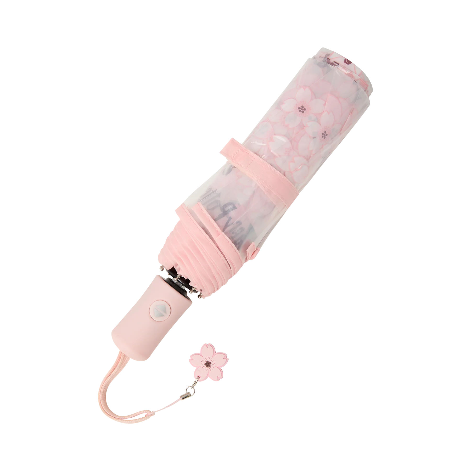 ハリー・ポッター サクラ 折りたたみ傘は、風に舞う桜から着想を得た、心ときめくアクセサリー。透明なキャノピーには、サクラコレクション限定のアートワークがあしらわれ、繊細なピンクの花びらがパネル全体に広がります。