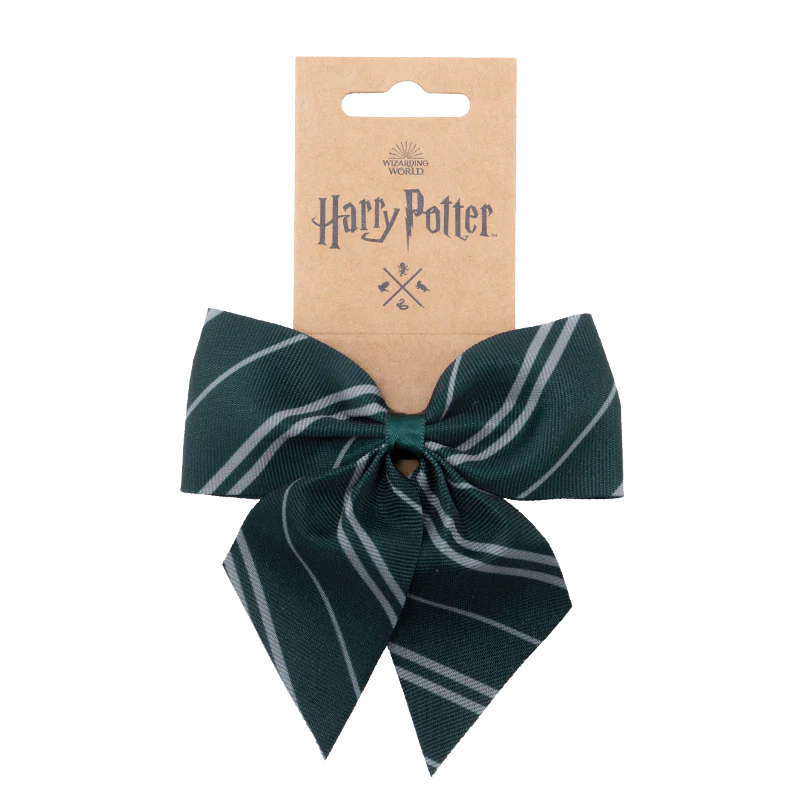 スリザリン寮のシンボルカラー、緑×シルバーグレーのリボンをモチーフにした鮮やかなバレッタ。リボンの裏側にクリップ状の留め具が付いています。